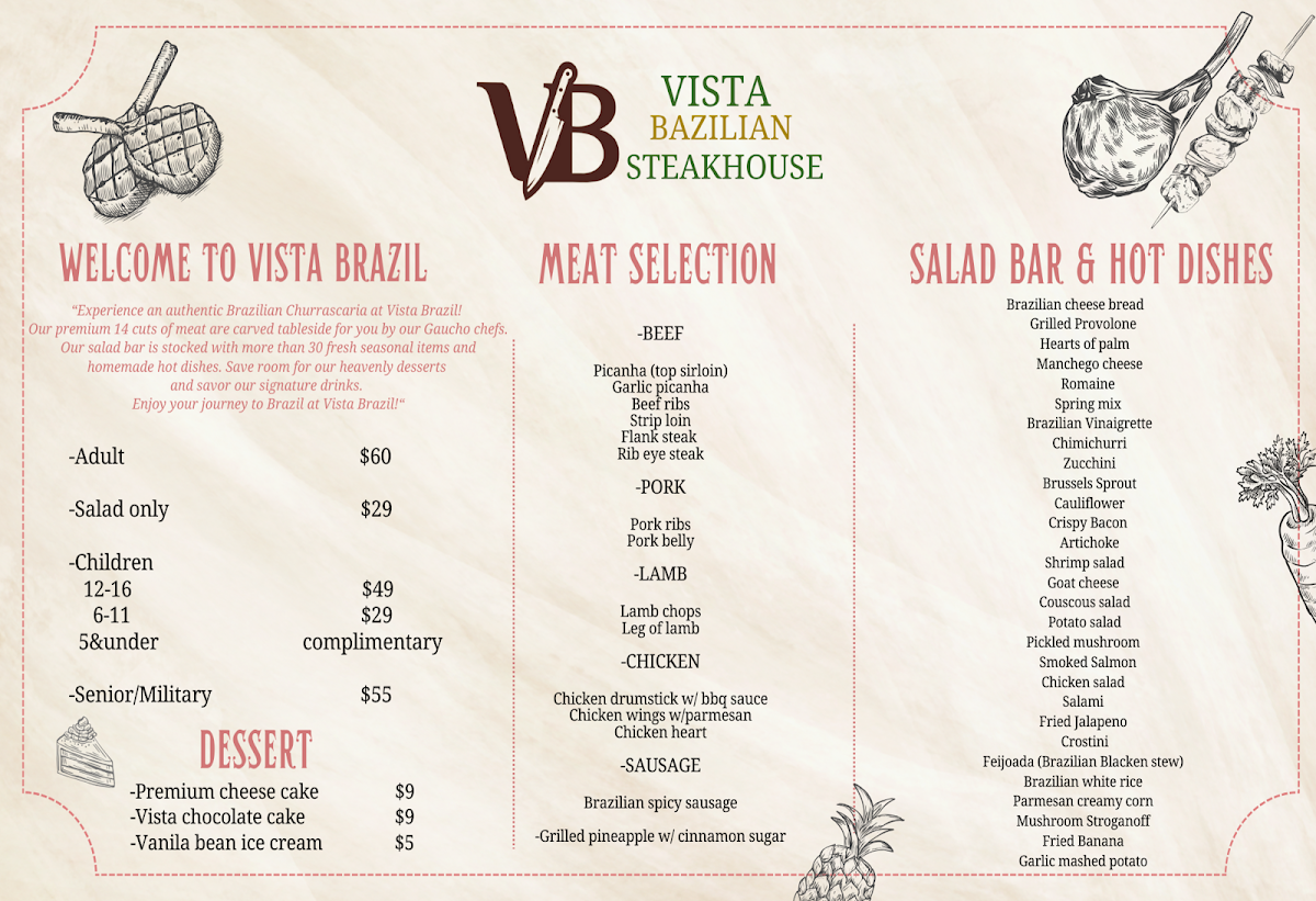Vista Brazilian Steakhouse delivers a menu that feels both indulgent and thoughtfully curated, with each dish reinforcing the restaurant’s commitment to bold, satisfying flavors. The Churrasco stands out as the centerpiece-perfectly grilled, juicy, and richly seasoned, capturing the essence of traditional Brazilian barbecue. Complementing the savory offerings, the drink selection adds a refreshing balance, with the Mojito providing a crisp, citrusy lift that pairs well with the heavier meats. Desserts round out the experience on a high note: the Chocolate Cake is decadently moist and deeply flavorful, while the Birthday Cake offers a lighter, celebratory sweetness that appeals to a wide range of palates. Altogether, the menu feels cohesive and well-executed, leaving a lasting impression that makes the dining experience both memorable and worth revisiting.